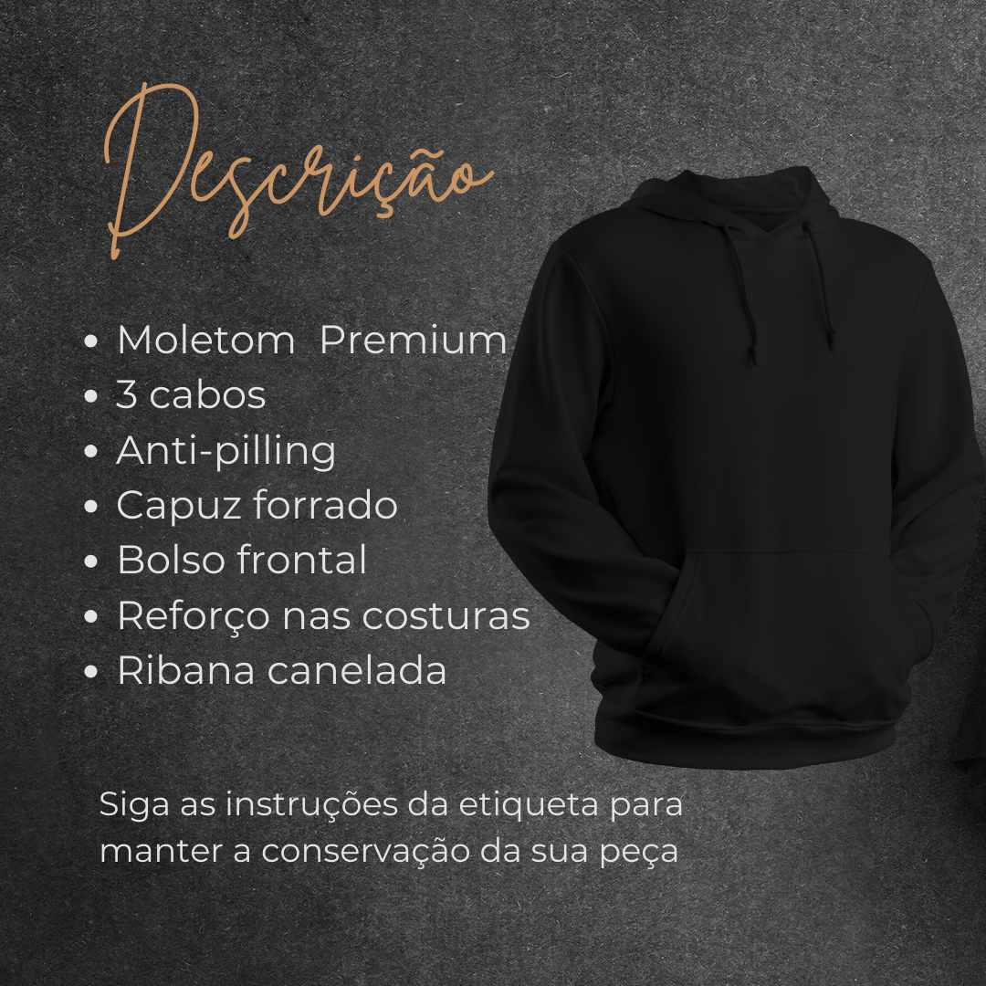Nossos moletons são 3 cabos, ou seja, o mais grosso e resistente do mercado e de durabilidade excelente, ideal para dias mais frios, pois são bem quentes devido também a sua parte interna ser peluciada. Capuz com forro em malha algodão 30.1 e acabamento com ilhós para o cordão. Tudo isso para garantir que você tenha em mãos um produto durável e de qualidade premium que proporcionam suavidade e maciez ao toque trazendo sensação de conforto ao vestir.